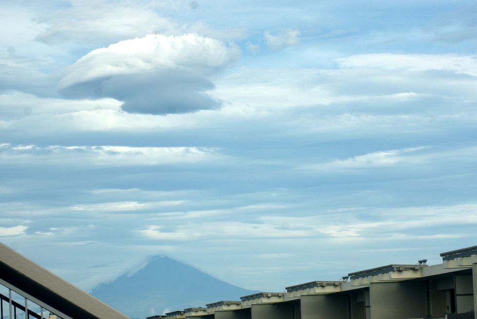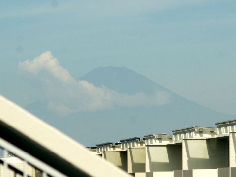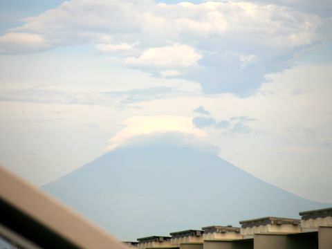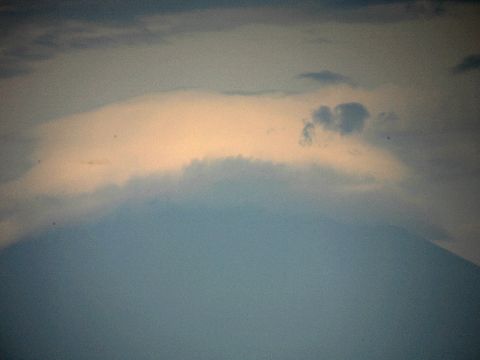 今日の富士山、雲が山頂に夏の時期は温度が高いせいか富士山が綺麗に見えることは稀、今朝は頭に雲の帽子を被った姿が見られた。下は「超望遠600mm」で撮影。 |