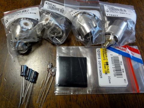買って来たもの一覧、他に同軸5mあり小容量電解コン3個、ネオンランプ2個(千石電商)放熱シート2枚、同軸コネクタ(おす・めす各2個)(秋月電子)、 同軸5D−FB−Rを5m(マルツ)。 |