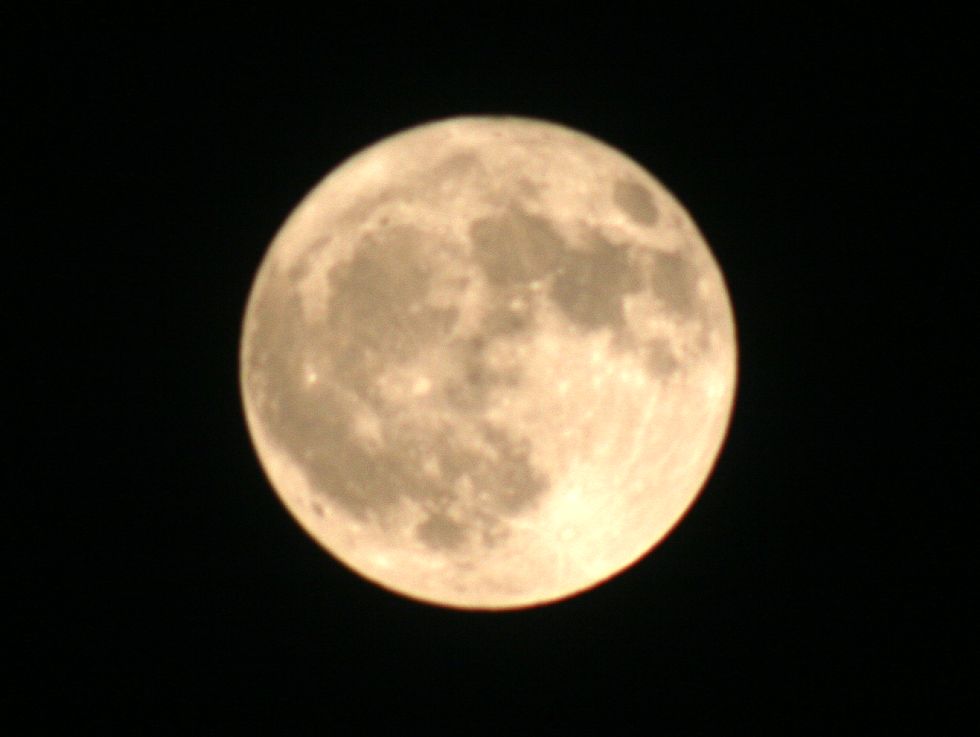 ほぼ満月の月やや霞かかった感じだが、撮影カメラ:CANON EOS30D+超望遠600mm*1.5、マニュアル露出 |