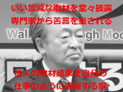 他人の調査成果も自分の手柄で喋る自分のチームならまだしも外部識者のコメントをさも自分の知識のように喋るインチキ解説者。ずっとそういうスタイルで やってきたので他人の成果も自分のものの様に喋るのか?ニッポンから二ホンへの変化で大俗説を自慢げに解説、 専門家から呆れられる失態。 |