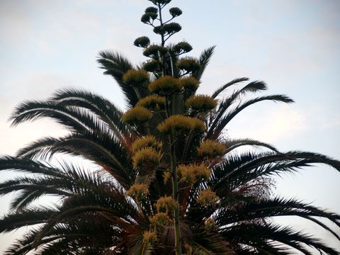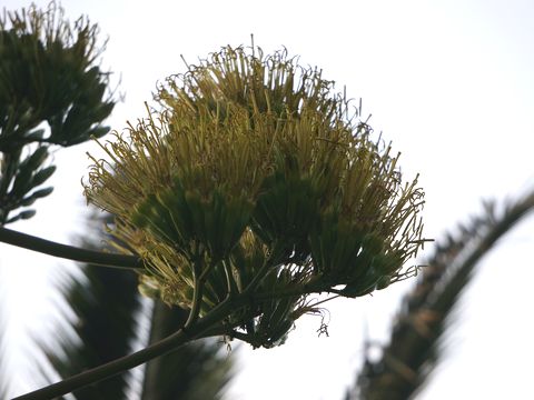 リュウゼツランが咲き始めた昨日の夕方の散歩で撮影、下半分くらいは開花した様子。 |