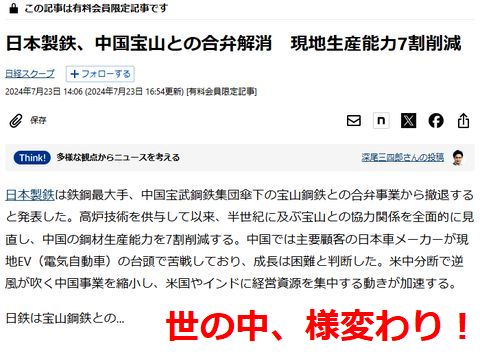 盛り上がらないパリ五輪・日鉄は中国撤退あと3日だとか、あまり盛り上がらないパリ五輪、3年前の東京五輪でIOCの金儲け体質(それが目的化)が露呈し だれもスポーツマンの為のイベントとは思わなくなったから(IOCは放映権を高く売るため夏季開催に、スポーツ団体には お金を配って文句を言わせないという構造)。 中国進出の花形だった日鉄の合弁、もう意味がなくなり撤退に。 |