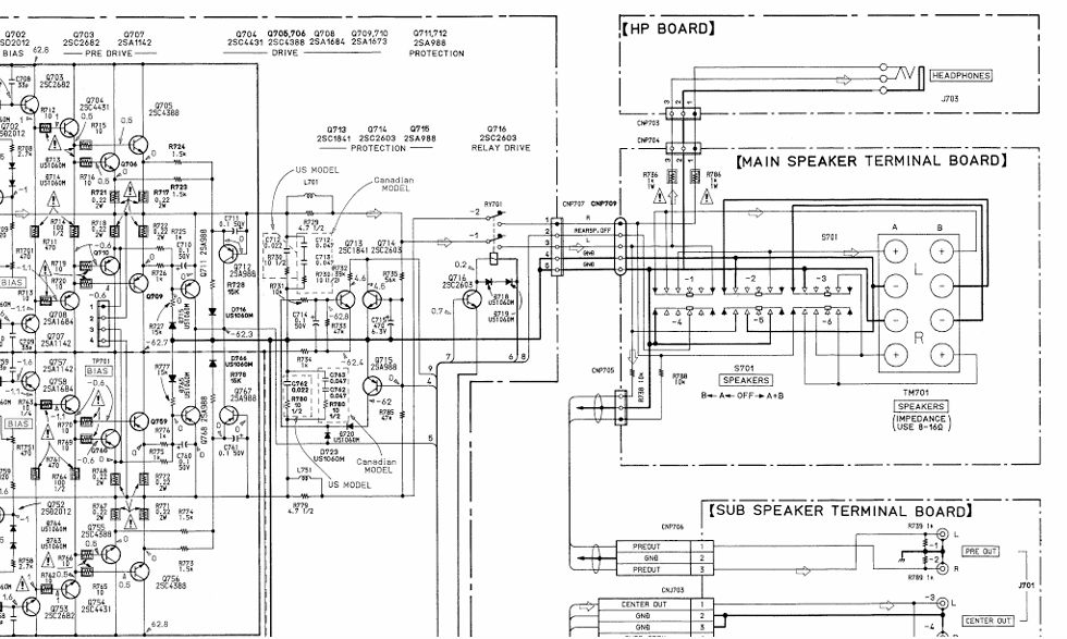 STR-D2020サービスマニュアルからヘッドフォン出力もプリアウトもpわーあんぷ段の出力リレーの後から接続されているのでリレー不良だと出力は無いことになる。 左に表示部に信号が出るので入力セレクタまでは正常にみえるが詳細は未確認。 |