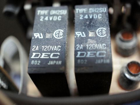 リレーを調査、大きさが違う!残念ながら大きさが全く違う、小さいほうは型式から調べると他のメーカのアンプにもよく使われていたよう。 2a接点なので通常販売のリレーではない、b側を切れば使えるものもある。メインアンプのリレーはかなり大きい。 |