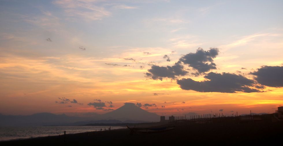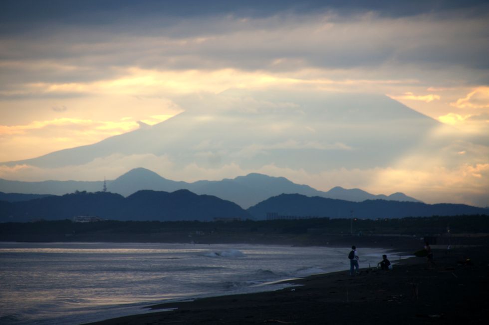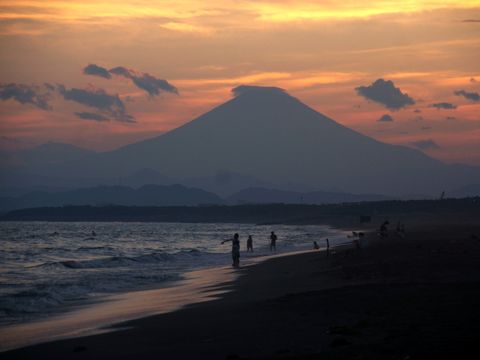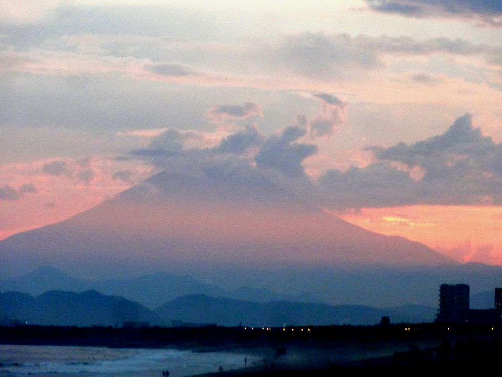 夕暮れの海岸から赤い富士山大相撲を見終わってから散歩に、まだ暑いが海岸は風があってまだ助かる、太陽の位置はまだ富士山から遠いが日没前の一瞬は 富士山の下が赤く染まる。 |
