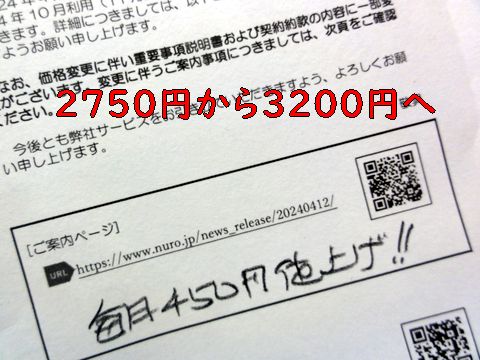 NURO光、しれっと値上げの通知「諸物価高騰」で値上げするとの通知が来た、4月から広報としているが聴いたことない。速度はゲーマーには不評らしいが それはそれで混雑しないと良い事でもある。まあこの価格なら文句は言わないけど。 |