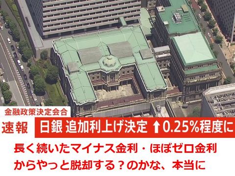 遅まきながら利上げへアメリカとの利率差が円安の大きな要素、輸出依存の企業は好業績だが国や国民は大苦戦、やっと日銀が利上げに。 住宅金利は上がるだろうが、預金金利も上がるかな? |