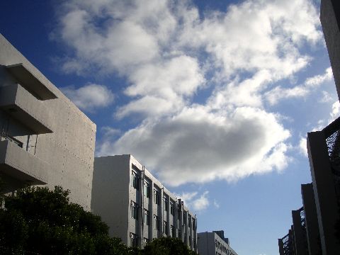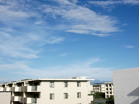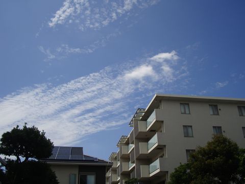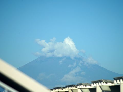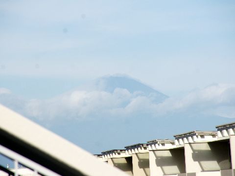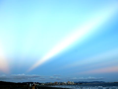 富士山は朝は見えたが朝は雲が少ないがあっという間に雲が湧いてきて、すっかり見えなくなった。夕方、江の島の方向に不思議な真っすぐな雲?。 |