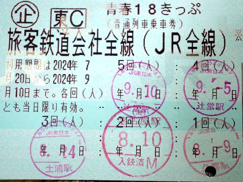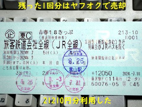 青春18きっぷの残り1回分はヤフオクで売れた5回分のうち4回を使用、残った一回分はヤフオクで売却、3100円(10%引かれるが)。 |