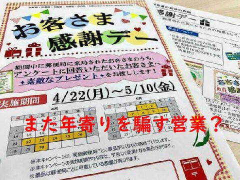 インチキ蔓延の日本郵便、郵便局長会「お金がある高齢者を狙って景品でおびき出すやり方は、たちが悪い。チラシだけでは『金融商品を提案される』とは予 想できず、消費生活条例に違反する可能性がある」と指摘する。簡保で年寄りを散々騙したのを、もうスッカリ忘れてる? 日本郵政グループの社外通報窓口が4月に情報提供を受けて調査し、その時点では問題はないと判断していた。 |