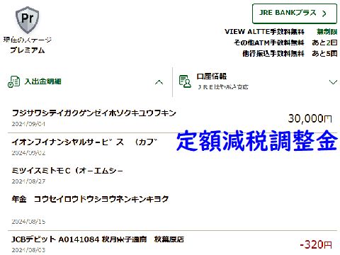 定額減税補足給付金が振り込まれた減税しきれない分が1万円単位に切り上げられ振り込まれる、公金振込口座はゆうちょ銀行からJREバンクへ変更した。 |