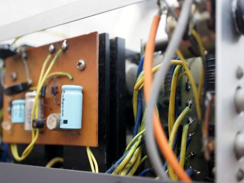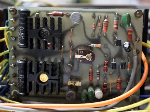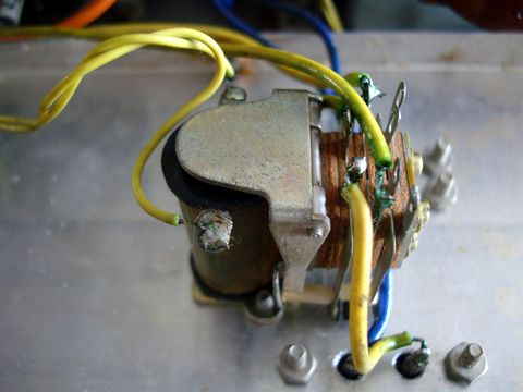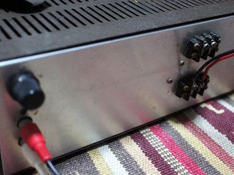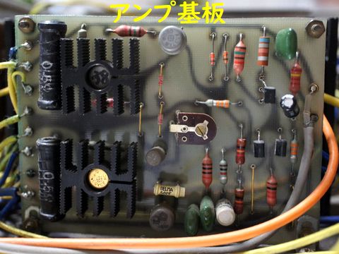 昔製作のアンプ、入力の電解コンを交換してみた配線類は大分傷んでいるのでアンプとして復旧できたら配線を総取り換えすることも計画。50年以上前のアンプだが抵抗器は金属皮膜形を 使用、0.5Ωの抵抗は巻線形(今はセメント抵抗が一般的)、位相調整のコンデンサも古いタイプである。 |