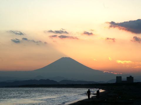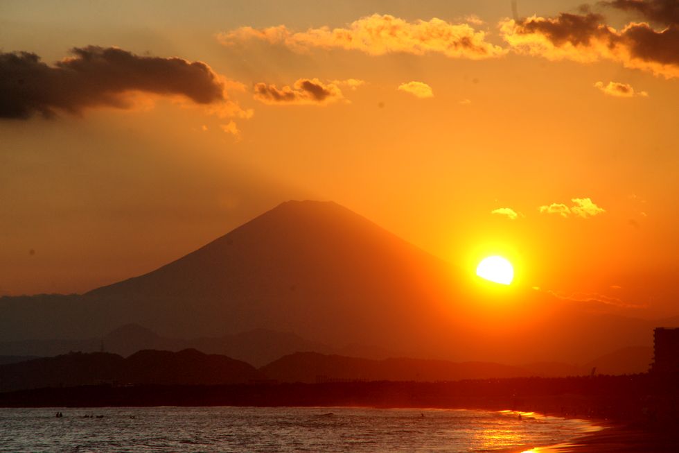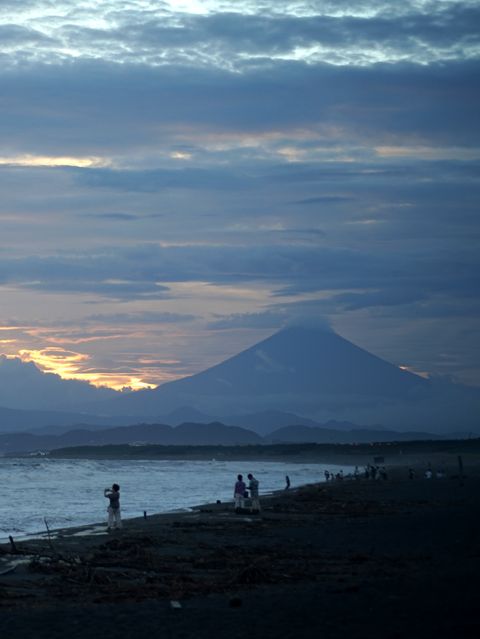 人が多い、結婚式前撮りの人も太陽は富士山の北斜面に沈んでいったように見える、明日あたりが頂上にかかるタイミングかも。 |