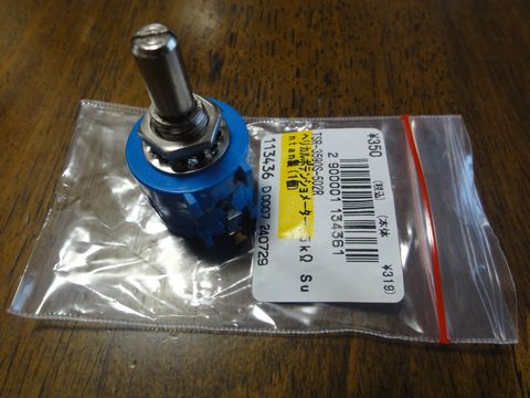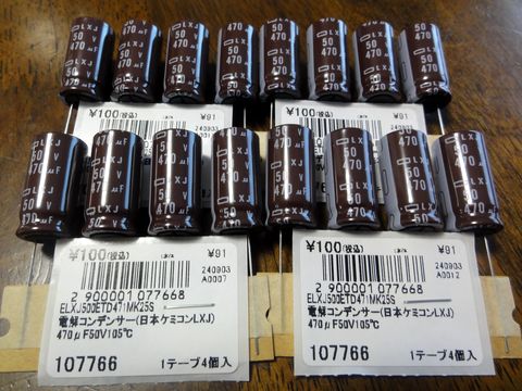 秋月電子での買い物アンプ補修用の電解コンデンサ(50V-470μF、4個組*4)、特価品BB、多回転ポテンショ (5kΩ)*2個。 |
