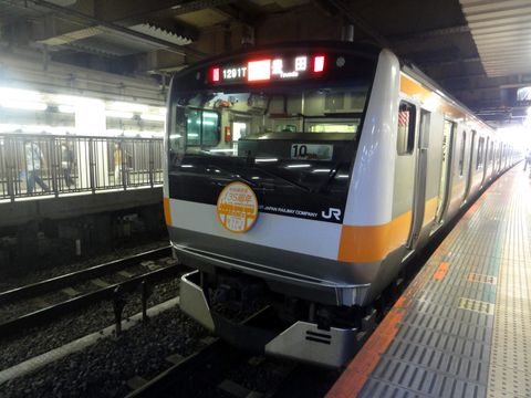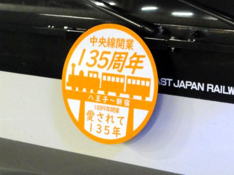 中央線開業135周年の記念表示お茶の水から乗った中央線快速には中央線開通135周年と記されたヘッドマークを付けていた。 |