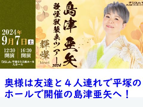 島津亜矢のコンサート趣味のサークル仲間であるおばさん4人組で平塚開催のコンサートへ行った。 |