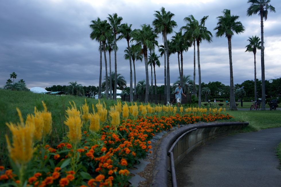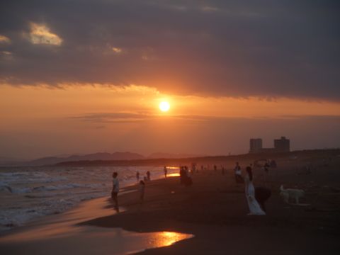 夕方の散歩に5時半ころから散歩に、風がなく蒸し暑い、波は無いのでサーファーは少ない。 |