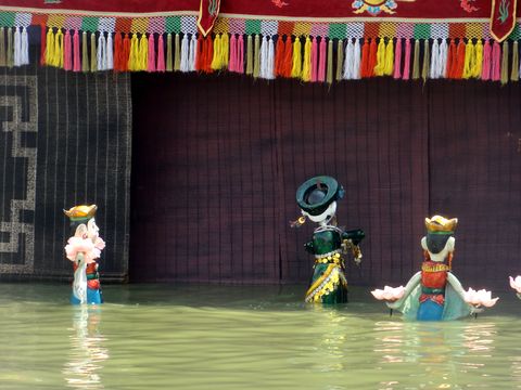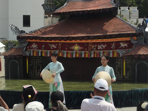 水上人形劇も上演あり一角のスペースで小さなプールを作って水上人形劇とベトナムの踊りが披露されていた、水が緑色なのは人形の仕掛けが見えないように しているよう(長い棒で後ろの幕の中から操作している)。 |