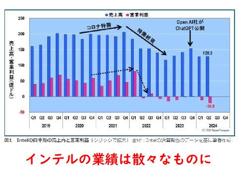 「インテル、終わってる」?最近も最新プロセッサで大規模なマイクロコード改修をする羽目になったインテル、プロセス世代交代も大幅に遅延しお先真っ暗な状態。 湯之上氏によれば、これは過去の2つの大きなミスジャッジによるそう、1つ目はアップルのiPhone 用プロセッサ開発の要請を断った事 (こんなスマホがPCを圧迫するとは思わなかったのだろうが)、2つ目は今の目玉AIでChatGPTへの出資依頼を断ったこと、 この2つは大きな成長の芽を自分で摘んだもの。 |