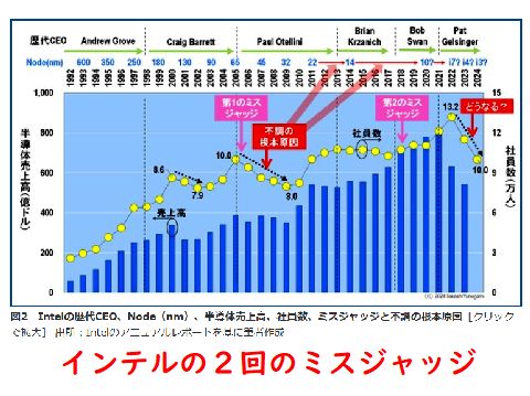 2つの間違いで大苦境を招いた!また苦境期に次々世代プロセスを支える人材を大幅にリストラしたことが現在の大苦境に繋がっている、すぐ利益の出ない先行開発投資 を切ることで数年後の大苦境へと繋がった。今度も大幅リストラする気だがもうインテルには将来はない?との疑念は晴れない。 |