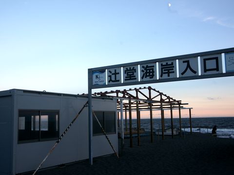 日が短くなった、6時で薄暗い風はあるが生ぬるいので暑い、営業終了の海の家は解体が進み骨組みとプレハブだけに。 |