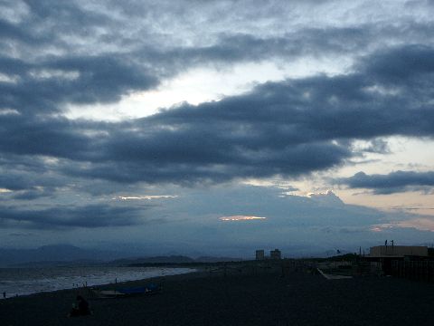 雨上がりの夕空夕方4時過ぎから強い雨、5時半過ぎには上がったの薄暗いが海岸の散歩に。富士山はうっすらと、房総半島の方向では雷が光るのが見えた。 |