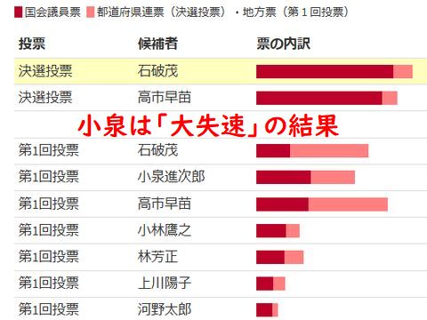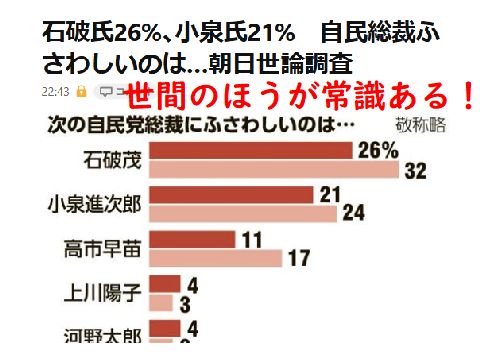 茶番の自民党総裁選だが一般の人気は汚い金に無縁?の石破氏、次が頭がお花畑の小泉進次郎(何故か菅義偉の二人羽織の風情だが)という順位、 他は箸にも棒にも掛からないレベル。それにしても河野太郎の不人気が際立つ結果。 |