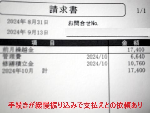 管理費の振込口座変更、何か緩慢8月から従来のゆうちょ銀行からの引き去りが中止されたが次の銀行の手続きが遅く(今日やっと連絡がきた)、今月分まで未納状態に なってしまったよう(こちらの責任とは思えない)、仕方なく指定口座へ振り込み実施(無料回数なので0円だが)、それにしても手続きが 緩慢というか鈍足で運が悪いと来月も振替できず「未納」にされてしまいそう。 |