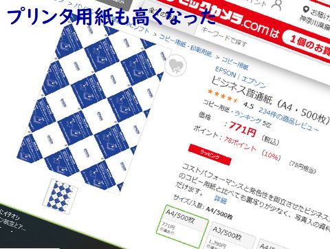 プリンタ用紙が高くなった昨日、帰り道にプリンタ用紙が欲しくてダイソーへ寄ったがなんと40枚で110円と高価に なっていたので購入中止。 帰宅後、ビックカメラで500枚入りで771円(送料ゼロ、ポイント利用で500円程度)を見付け注文。 紙はあっと言う間に値上がりして100均で買うのが安くはなくなってしまった、何故かインクジェット紙は70枚入りで110円だった。 |