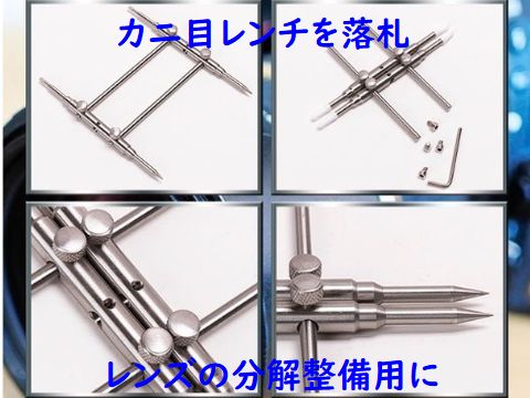カニ目レンチが届いた、早速使ってみるキヤノンの汚れたレンズを早速ばらして前玉の裏をクリーニング、ここは綺麗になったが他のレンズも汚れているので失敗か。 |
