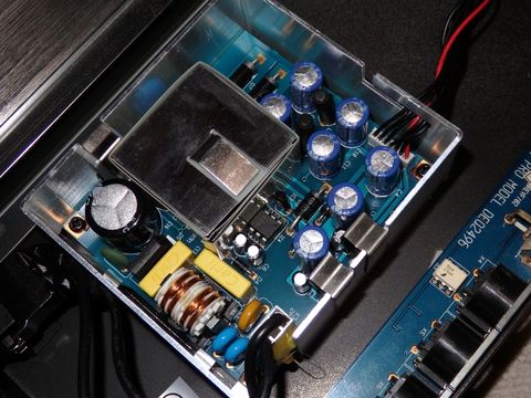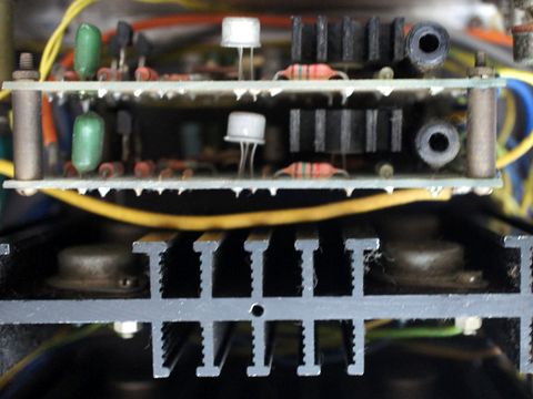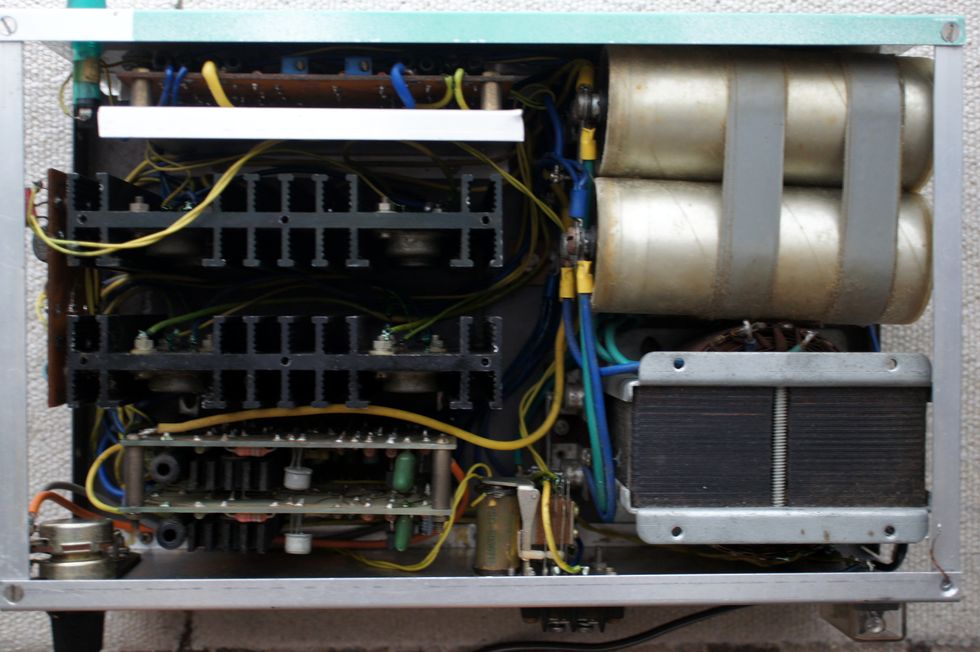 アンプ基板部と放熱板アンプの構成はピュアコンプリメンタリの正負電源を用いたオーソドックスな回路、アンプ部の信号回路に電解コンデンサは 入力部に1つあるのみ。放熱板2個に正負電源部の4つと合わせ計8個のパワートランジスタを取り付けてある。 |