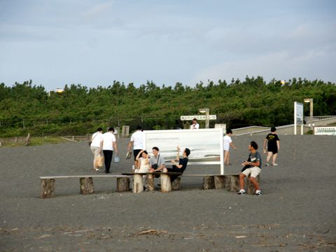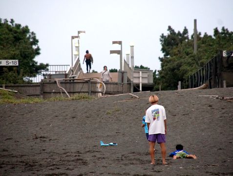 休日で海岸には家族連れが多数適度に波があるので海岸の家族連れ以外にもサーファーが多数。 |