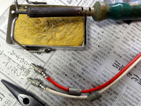 レコードプレーヤのケーブル修理?RCAプラグを触るとゴソゴソ音がするので接触不良を疑い、再ハンダを実施。 |