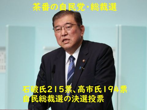 自民党総裁選は石破氏:アホノミクスの再来は嫌?右翼の高市早苗はアベのアホノミクスの継続を主張していたが、結局は石破氏の勝ちとなった。派閥解消と言いながら派閥の長が 誰に入れろと指示する派閥時代そのものの実態は改善見られず、まあ次善の選択かも。 |