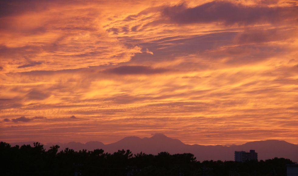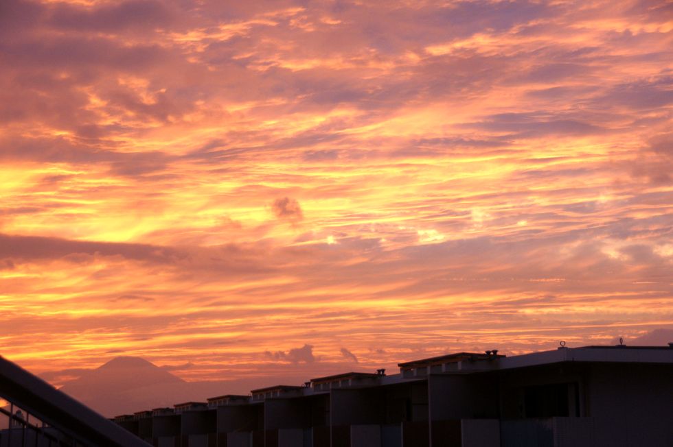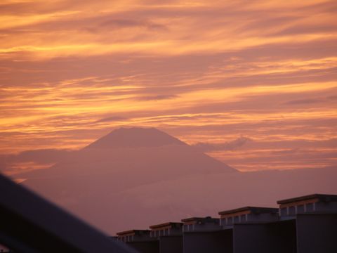 真っ赤に焼ける空と富士山ひょっと外を見ると西の空が真っ赤に、急いで公園まで行ったがあっと言う間に陽が沈み、残念。 |