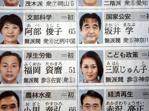 新政権、女性閣僚は2人だけ、人材難?いない訳ではないが高市や稲田といった右翼のおばさんが跋扈する自民党女性議員。昔は田中真紀子もいたな。 |
