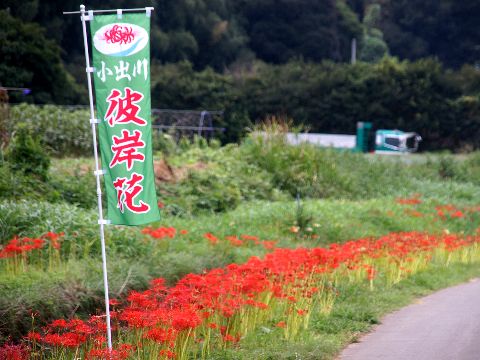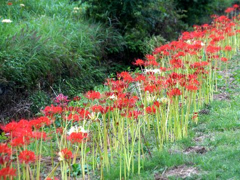 例年より黄色の彼岸花が多いようなバス停から近い大黒橋から次の小出橋までは結構咲いているが、その先はほぼ緑色だけで咲いていないという状態。 |