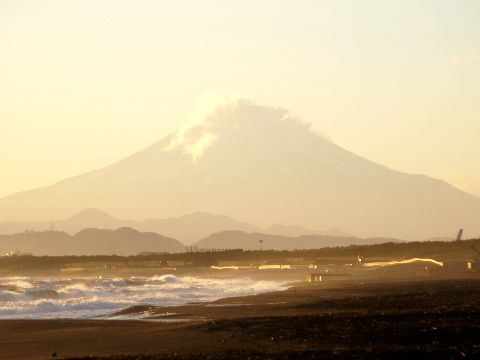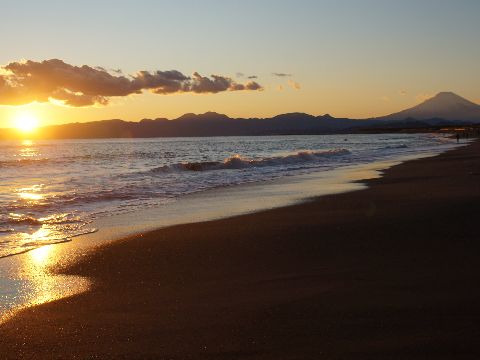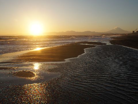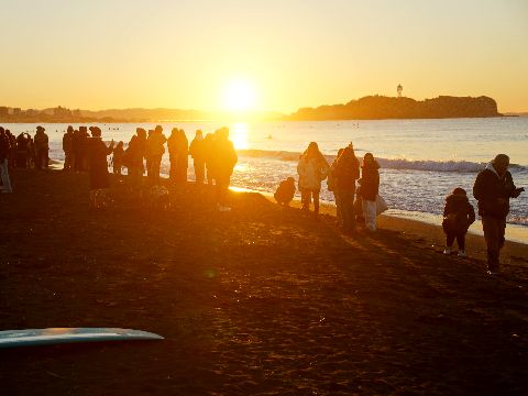 初日の出を見に辻堂海岸へ日の出は6時50分ころだが、辻堂海岸からでは山の端から昇るので少し遅くなる。 |