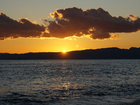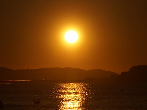 海岸夕景@辻堂海岸風もなく波もほとんど無い穏やかな海、サーファーは誰もいない(サーフィンは無理)。低い雲の中へ太陽が沈んでゆくが下の隙間から光芒が漏れる。 |