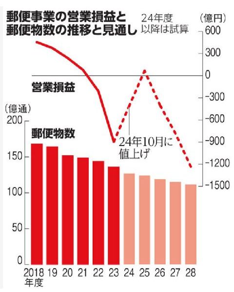 それでも減らない郵便局数が赤字を拡大需要減に対応しない郵便局数の維持(局長会という圧力団体のせい)で赤字拡大>値上げ>さらに需要減という 悪循環が続く状況、悪循環を断ち切れないと郵便局の衰退は必至。もう昨年で郵便局の利用は実質停止したので困らないけど。 |