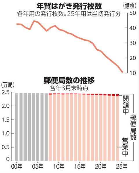 人口減と電子化で大きく減少する郵便需要その実態を如実に表すのが年賀状の枚数激減、電子メールやスマホアプリの普及で年賀状はもうオワコン状態。 年寄りはに年に一度の生存確認の意味合いが強いので限定で続けるが「年賀じまい」の挨拶もちらほら。 |