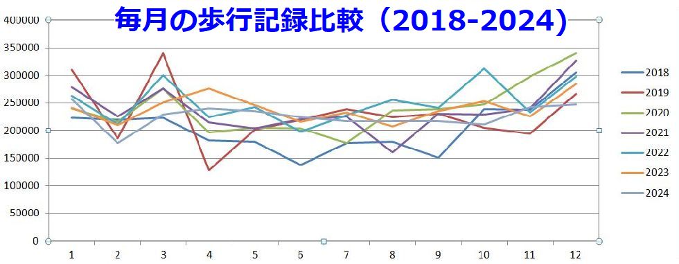 歩行記録の比較・対比2018年から毎月の歩数の対比を行ったもの、月によって日数のバラツキがあるがm極端に低いのは体調不良か天候不良の 証だろう。年末になると頑張るのは何故? |