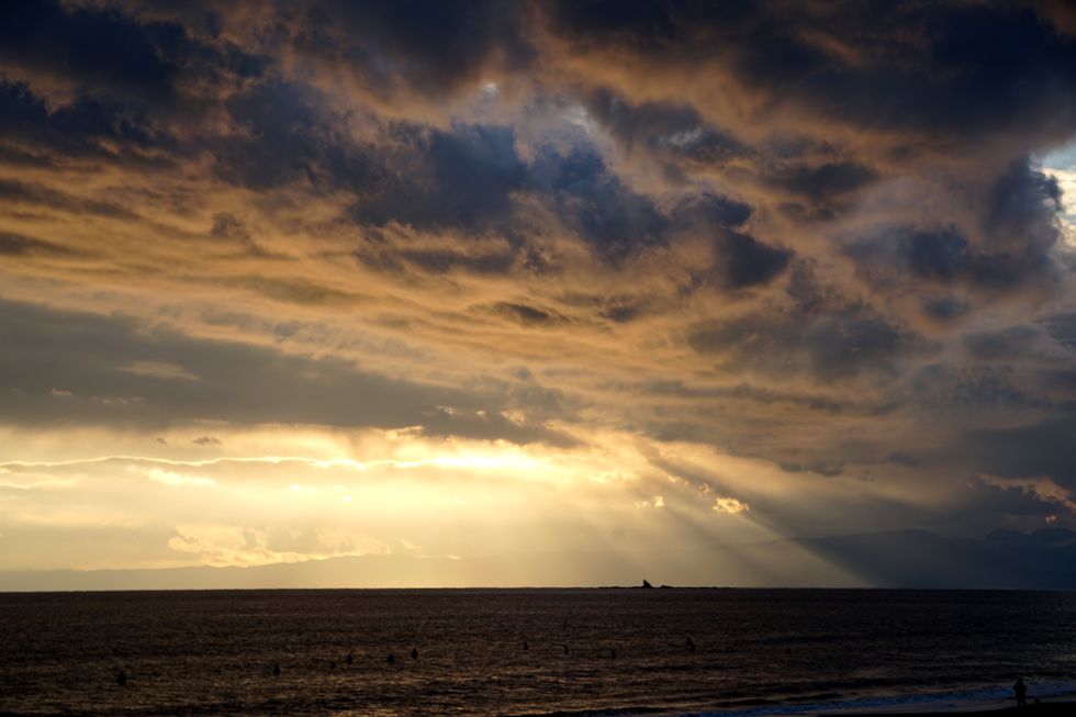 日没@辻堂海岸雲が多く富士山は全く見えない、雲の合間から光が漏れてくるという風景。