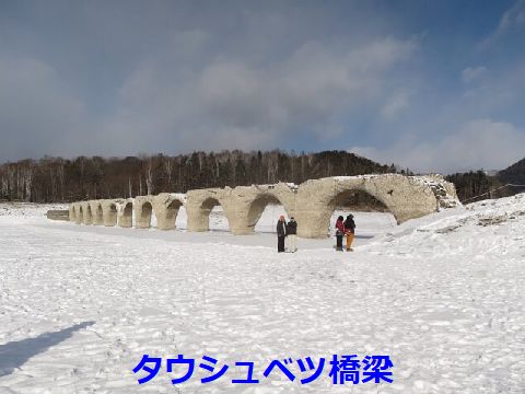 今年のタウシュベツ橋梁は水位低下が早い発電量が多いせいか水位低下が早く、あっと言う間に橋が見えている風景になってしまった。水位低下が早いと湖上の氷の 上を歩ける時期が早く終わってしまうとの心配もあり。 |