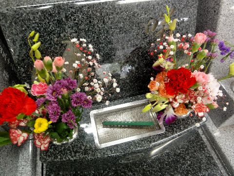 墓参りに、今日は暖かいまだ100円の花はないが入れ物は撤去してないので、そのうちに復活するのかも?気温が低いので花は長持ち。 |