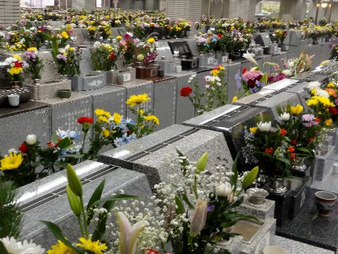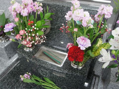 今年初めての墓参りに雨がぱらつく中で今年1回目の墓参りに、イオンはまだ通常モードでなく安価な花はなし。 霊園内はどこの墓も花がいっぱい。 |
