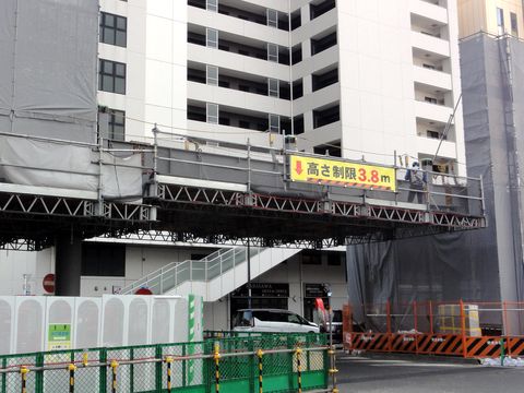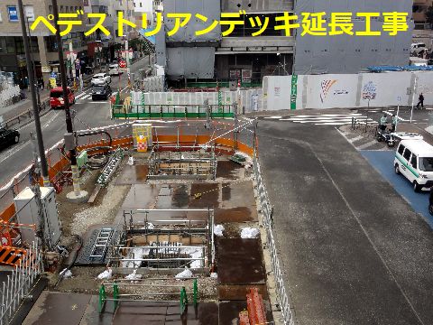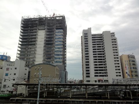 駅前の高層マンション、大分上まで完成南口のペデストリアンデッキの延長のための脚部工事も進行中、どうやら脚は3本作るよう。 |