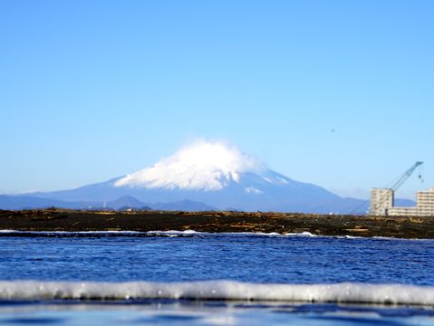 潮溜まり越しの富士山風が強く潮溜まりに綺麗な姿は映らないのは残念だが。 |