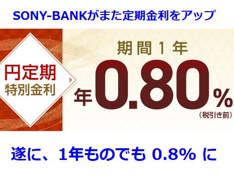 定期預金の金利が0.8%に年末に0.6%になったと思っていたら、今度は0.8%にアップ、預け替えでも適用されるのでさっそく預け替えするか。 |