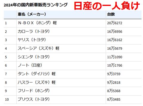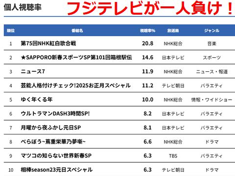 一人負けのニッサンとフジテレビ軽自動車は相変わらずの好調(でも日産はなし)だが日産は僅かにノートがランクイン、でもこれって儲からない車の はず、トヨタの一人勝ちが続き4車種がランクイン、軽以外では日産とホンダが一つづづという惨状 テレビでは年末年始はNHKが好調、日テレとTBSが2つづつ、フジテレビとテレビ東京は無し。 |